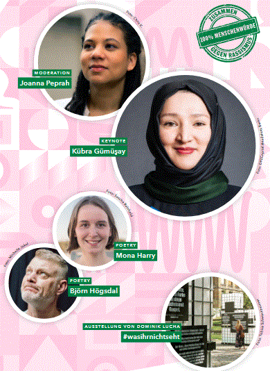 Ein Abend mit der Autorin des Bestsellers „Sprache & Sein“ und Moderatorin der Gesprächsreihe „Utopia Talks“, Kübra Gümüşay, ein. Die Keynote wird The men im Zusammenhang mit strukturellem Rassismus und sprachlicher Gewalt fokussieren und kritisch reflektieren. Im Vortrag wird Sprache als Deutungs- und Wahrnehmungsrahmen beleuchtet, der rassistische Strukturen reproduziert.