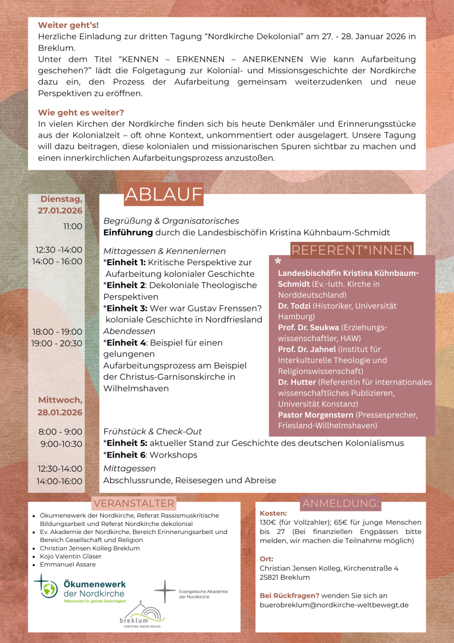Tagung Nordkirche Dekolonial Foto von Eric Rothermel auf Unsplash Dienstag27.1.202611:00 Uhr Ort: Christian Jensen Kolleg, Kirchenstr. 4-13 25821 Breklumweitere Informationen Worum geht´s? Flyer: Nordkirche Dekolonial 2026